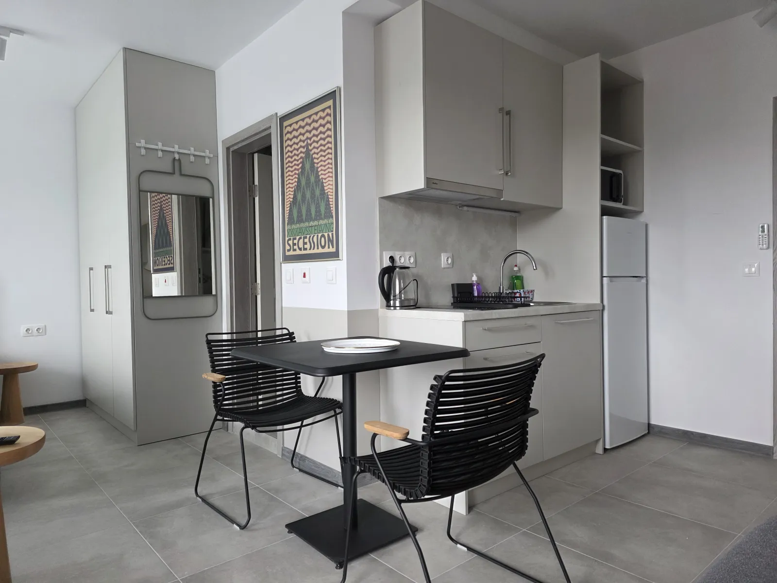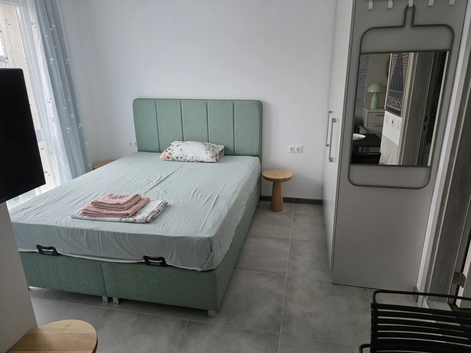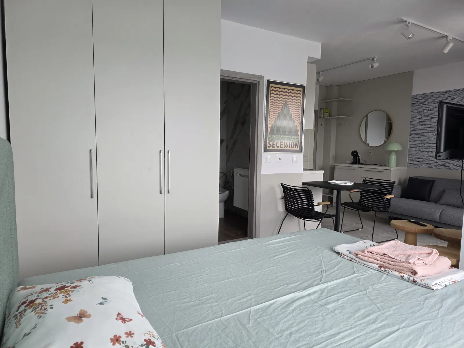 Просторно студио с тераса и градинска гледка. Тихо и свежо.