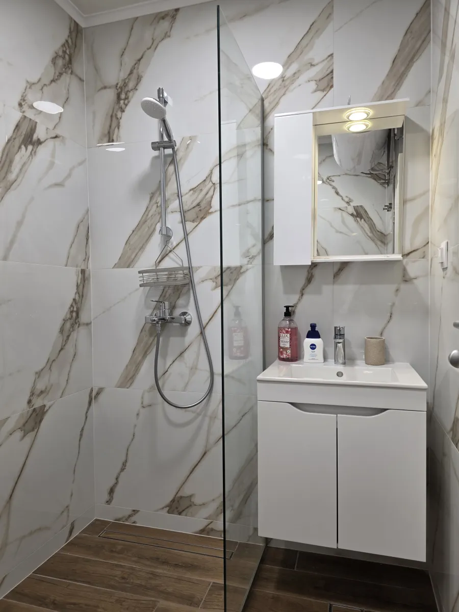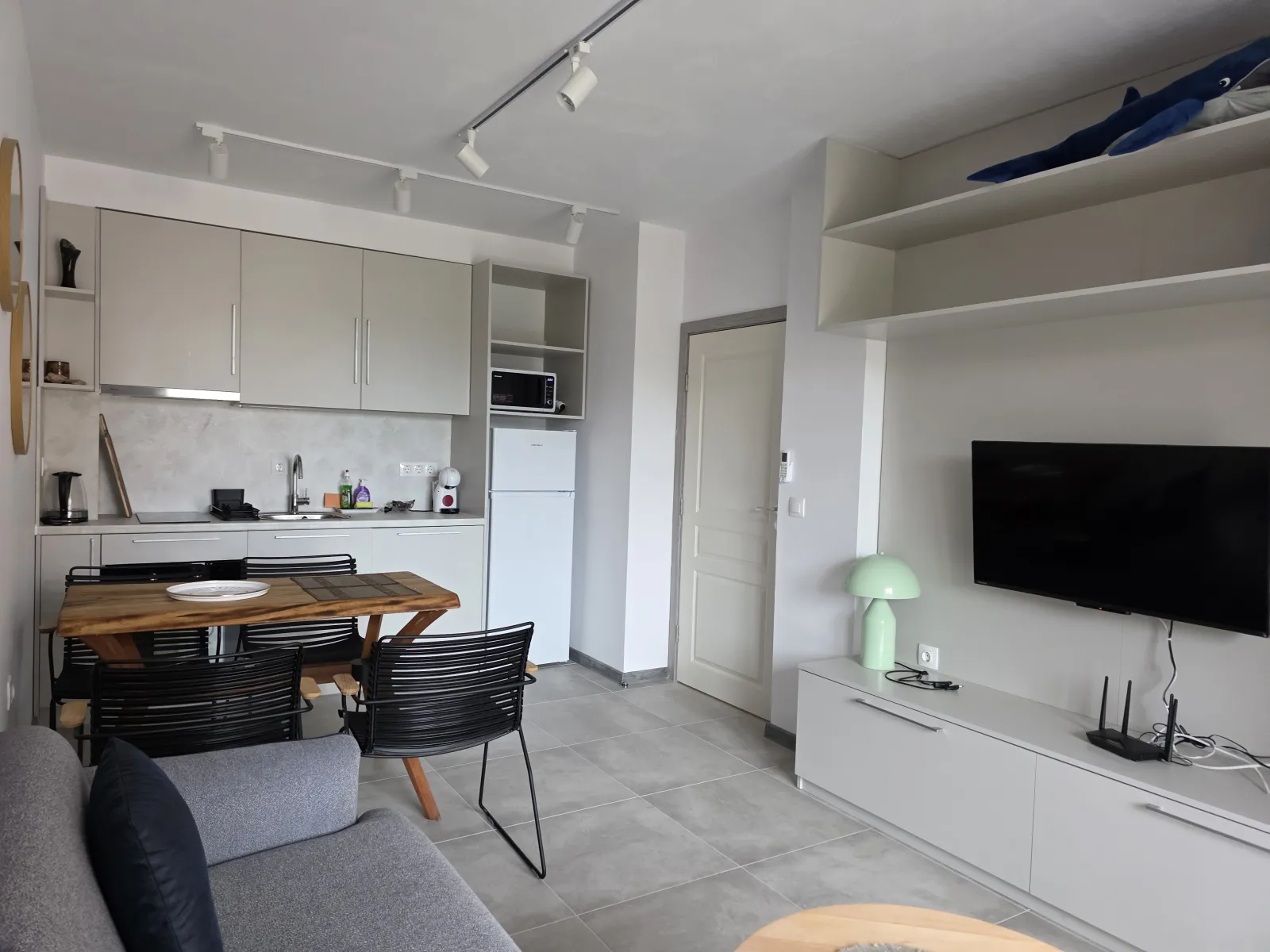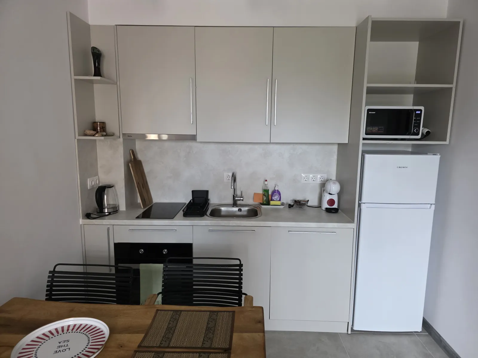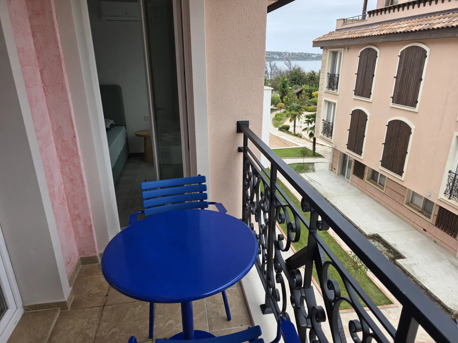 White Sands Boutique е луксозният избор в комплекса — дизайнерски едностаен апартамент с частна тераса и панорамна гледка към морето и инфинити басейна. Висококачествен интериор с мраморни детайли, спалня с кинг-легло, напълно оборудвана кухня с пералня, климатик и смарт телевизор. Паркомясто включено. При пристигане — приветствена кошница с местни продукти.